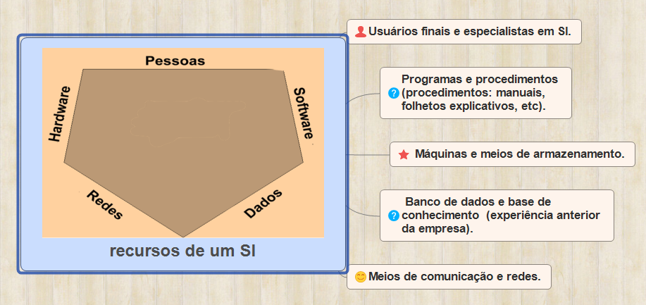 Continuemos a estudar mais um pouco sobre Sistema de Informações! O mapa mental a seguir mostra quais os componentes ou recursos de um sistema de informação. As pessoas que interagem com o sistema são, na verdade, um componente. Tanto os usuários finais como os especialistas em sistemas fazem parte do recurso Pessoas.