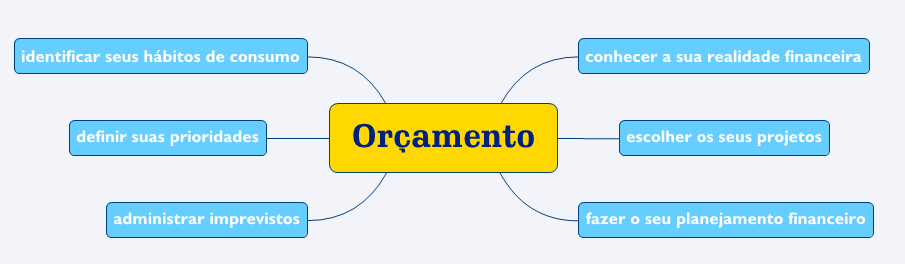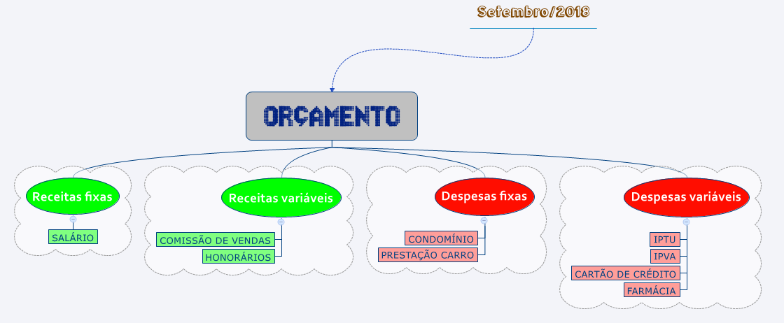 Pois é, os mapas mentais podem ser seus aliados no controle dos seus gastos. Visualize a seguir os mapas que a Josiane construiu durante o curso Mapas em Ação. O primeiro mapa mostra a importância de se fazer o orçamento financeiro. E o segundo, é um exemplo de mapa que apresenta as despesas e receitas no mês de setembro.