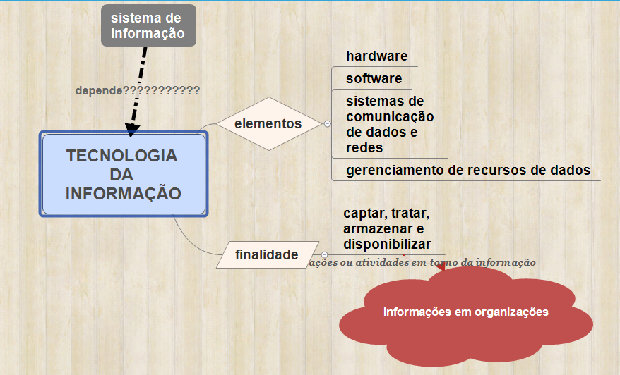 Existe uma dependência, por exemplo, entre o conceito de sistemas de informação e tecnologia da informação. Isso você pode materializar usando uma mapa conceitual, como aquela exposto a seguir. Cada pessoal pode fazer uma mapa diferente para expressar a mesma coisa. Isso é legal de se ver!!!