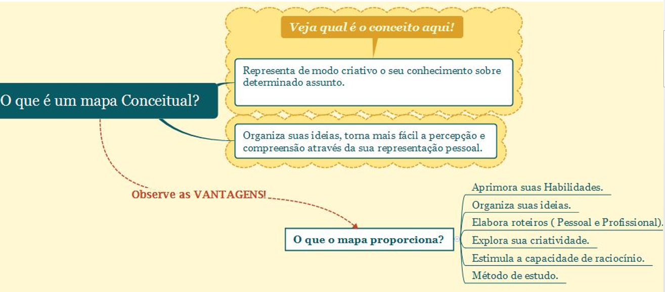 Com esse tipo de mapa, você pode fazer o que é possível com os mapas mentais e, além disso, pode relacionar objetos, conceitos, ideias e conhecimentos. Você apresenta mais facilmente as comparações, relações de diferenças, semelhanças, dependências, agregações e muitas outras relações estabelecidas no nosso cérebro e “materializadas” em pensamentos do dia-a-dia da nossa existência como seres humanos. Por meio do mapa mental a a seguir, você pode visualizar o conceito e as vantagens do mapa conceitual.