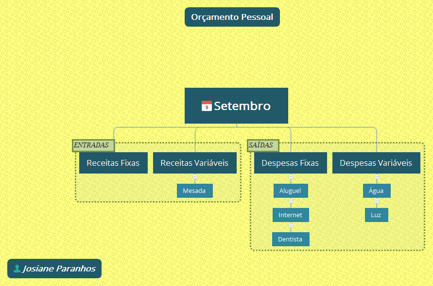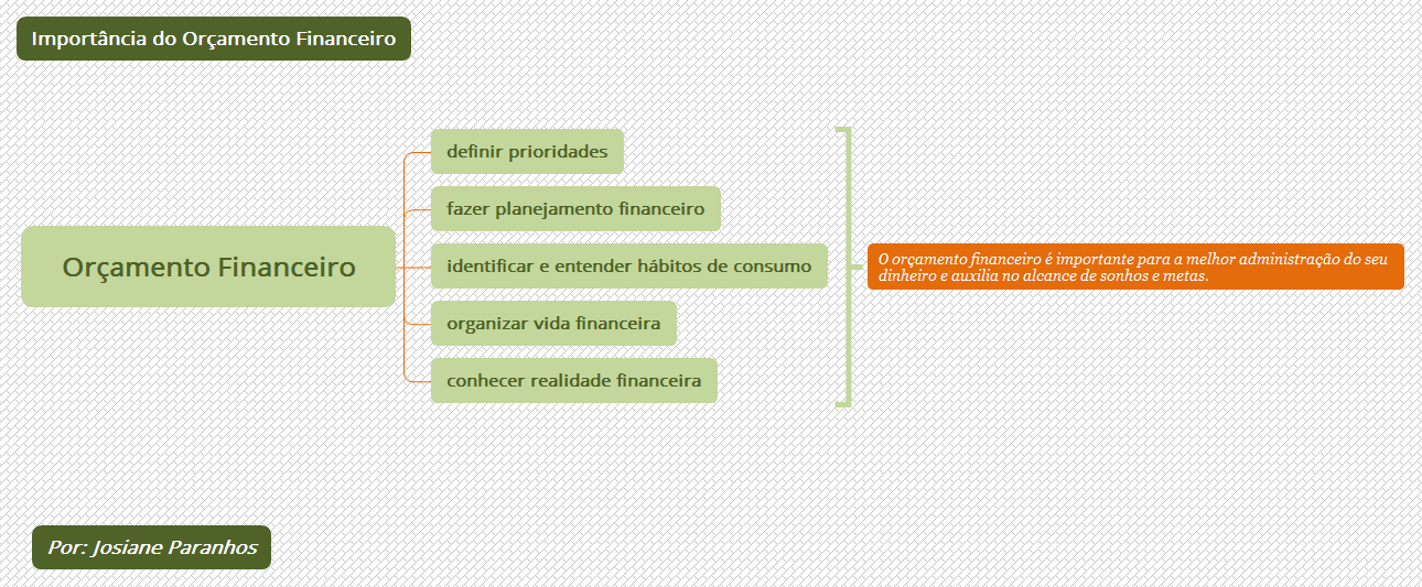 Pois é, os mapas mentais podem ser seus aliados no controle dos seus gastos. Visualize a seguir os mapas que a Josiane construiu durante o curso Mapas em Ação. O primeiro mapa mostra a importância de se fazer o orçamento financeiro. E o segundo, é um exemplo de mapa que apresenta as despesas e receitas no mês de setembro.