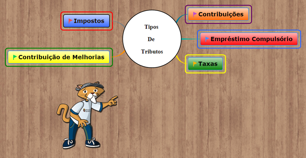 Este Mapa Mental lista os 5 tipos de tributos existentes no Brasil.