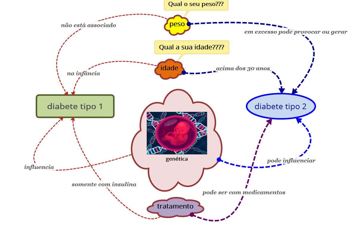 Então, a diferença entre diabete 1 e 2, inicialmente pode ser visualizada a partir do mapa conceitual a seguir.