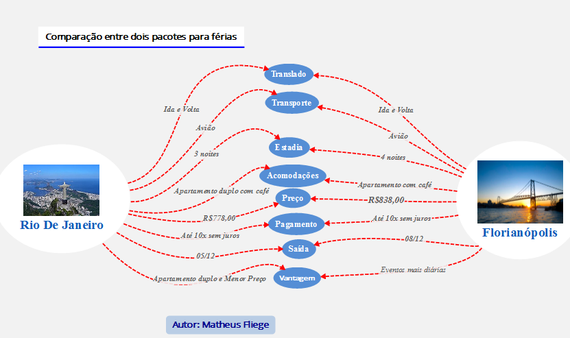 Os mapas conceituais são bons aliados em comparações. Por exemplo, se você quiser decidir entre dois pacotes de viagens para férias. Visualize o mapa a seguir. Não fica fácil de decidir?????